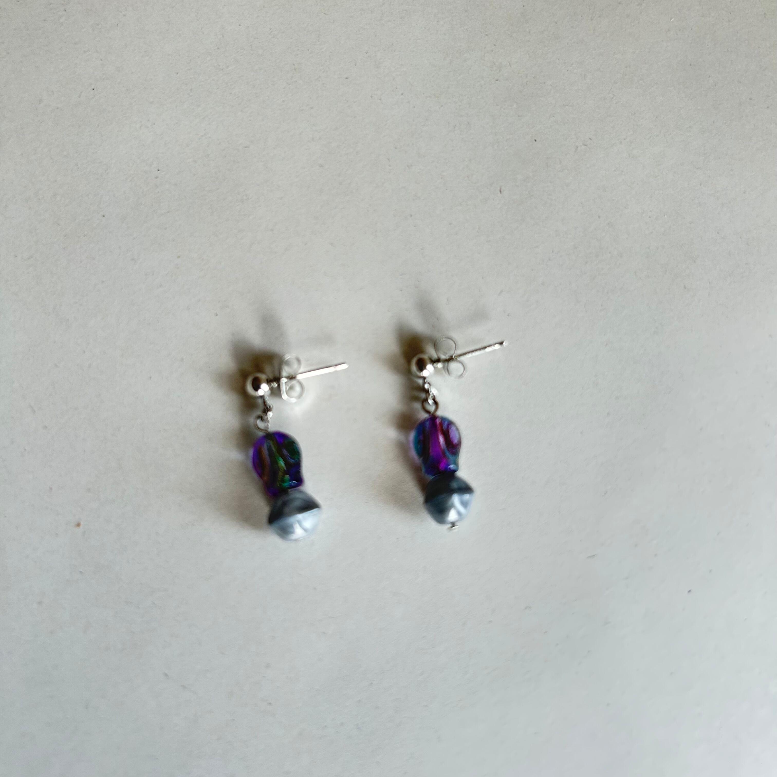 見る角度によって色味が変わる、オーロラカラーのビーズと、落ち着いた光沢感のグレービーズを組み合わせた、個性と上品さをあわせ持つピアスです。