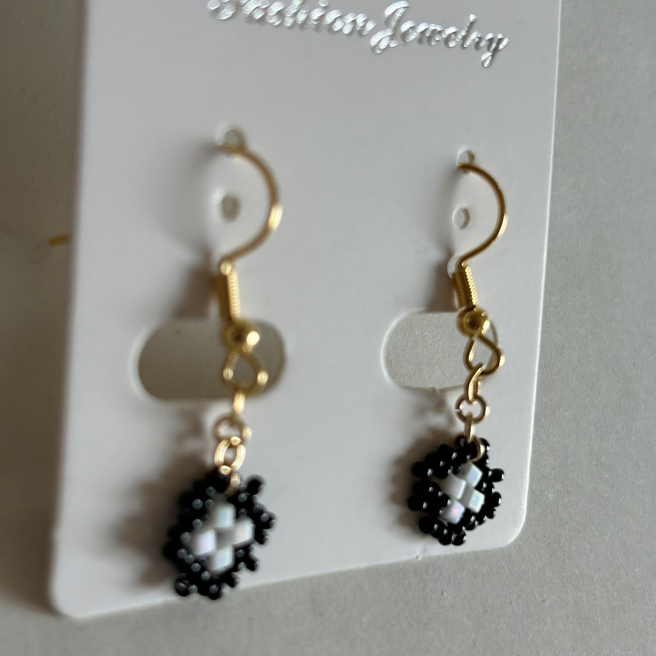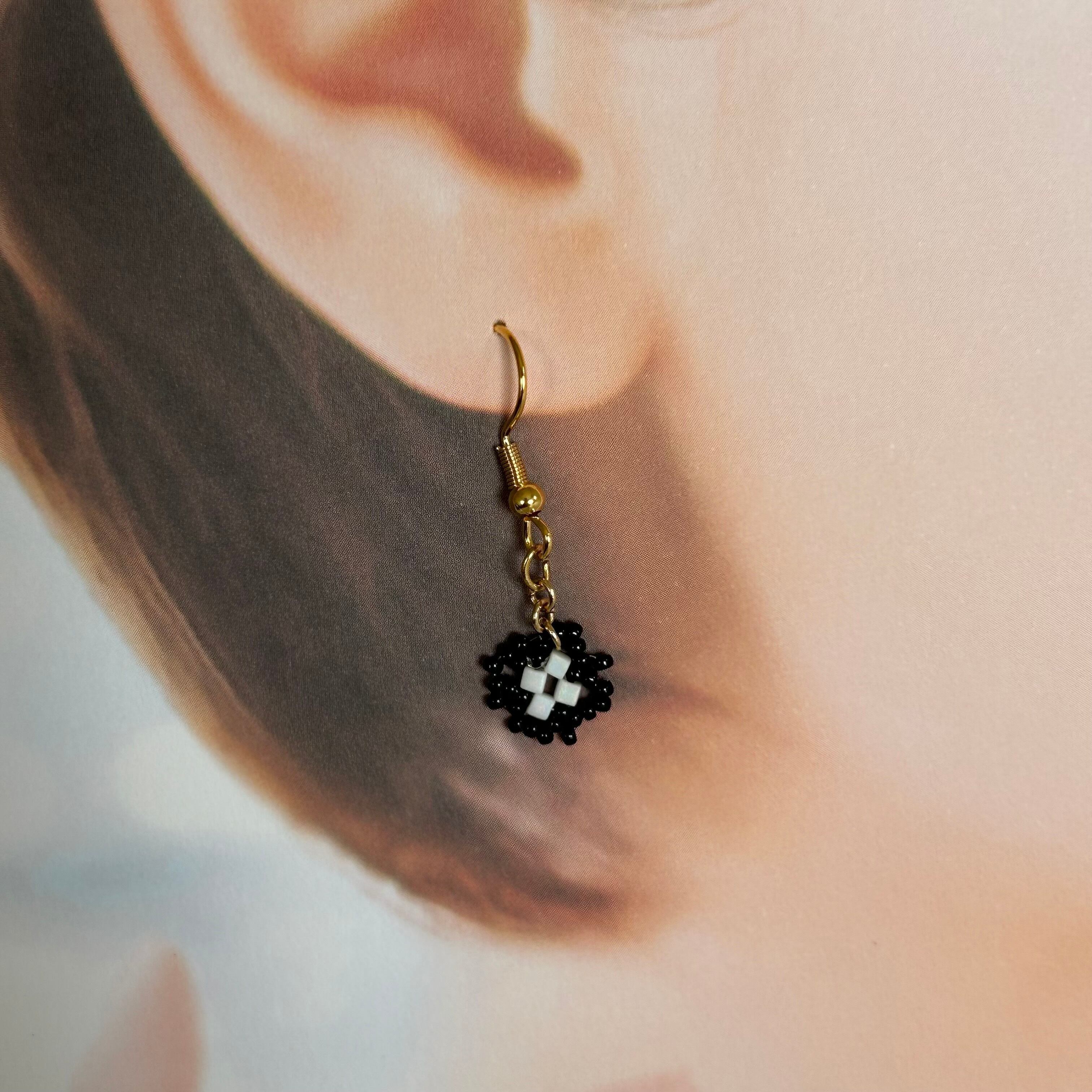 白と黒のビーズで編み上げた、モノトーンカラーのお花ピアスです。