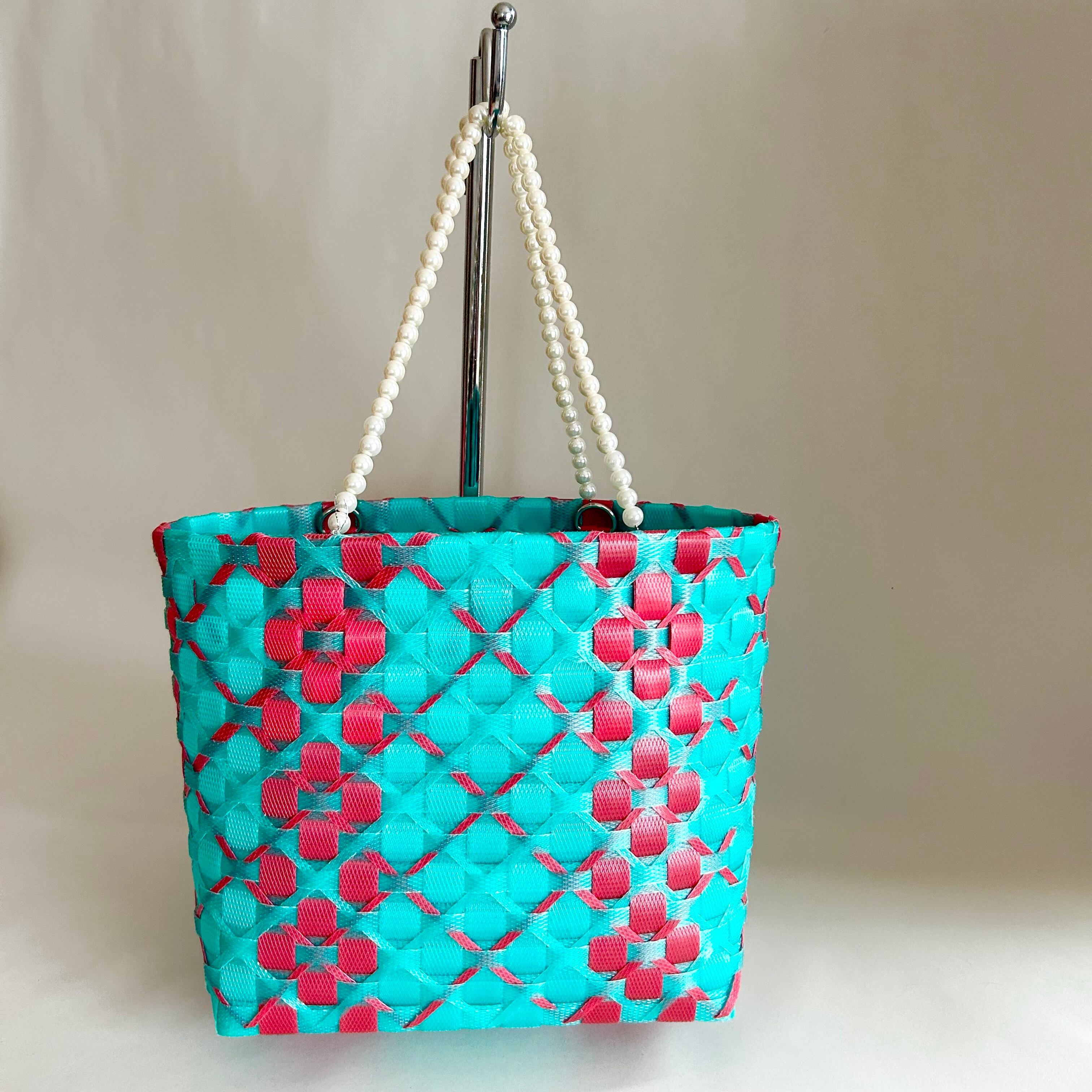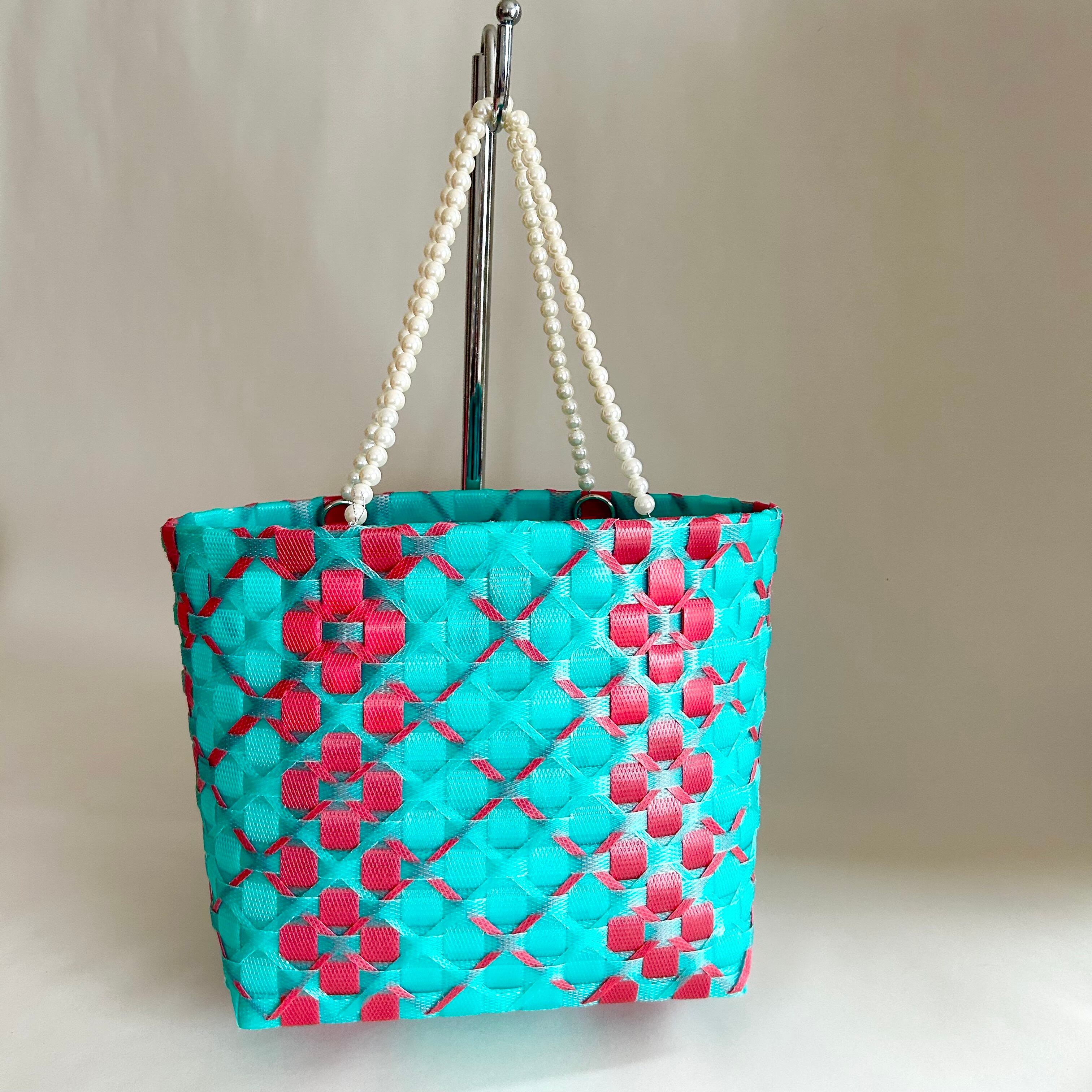 検索用:プラカゴバッグ/PPバンドバッグ/紅梅模様/花柄バッグ/パールハンドル/手編みトート/ターコイズブルー/ピンク/春バッグ/ハンドメイドバッグ/イチゴイチエ