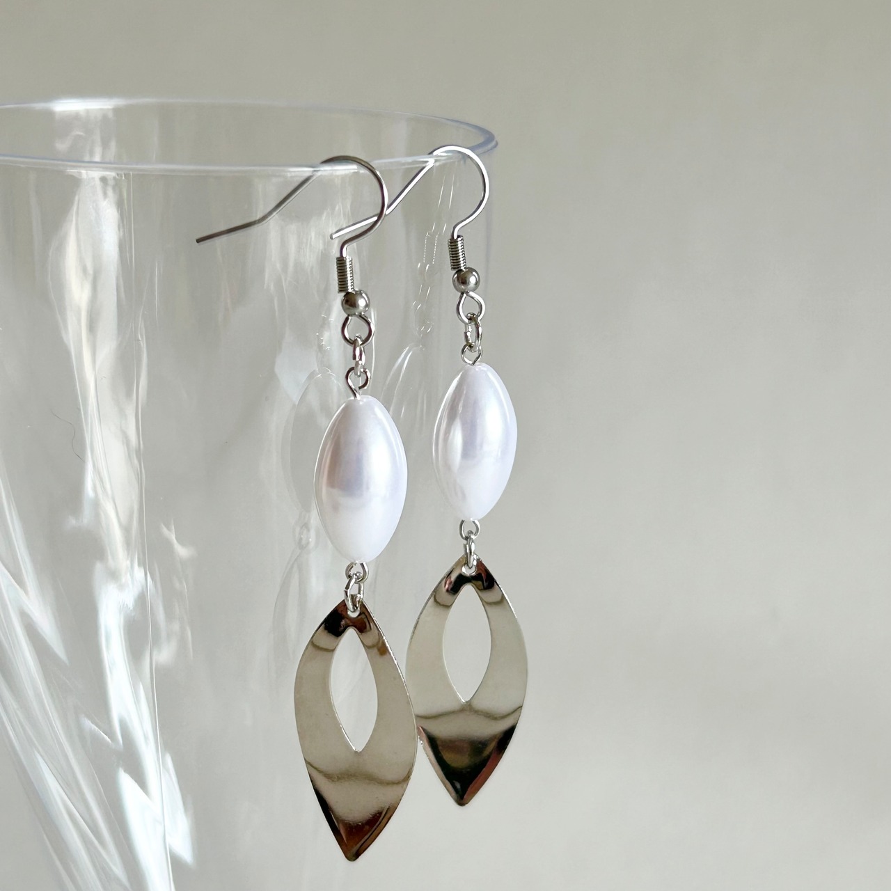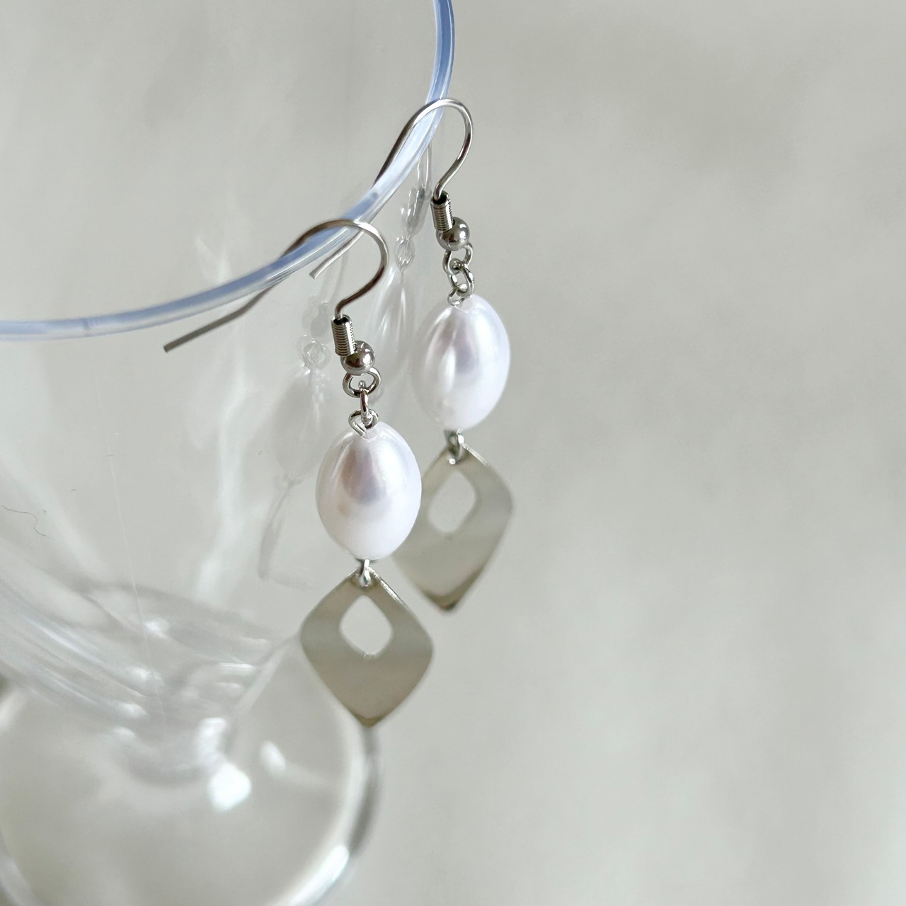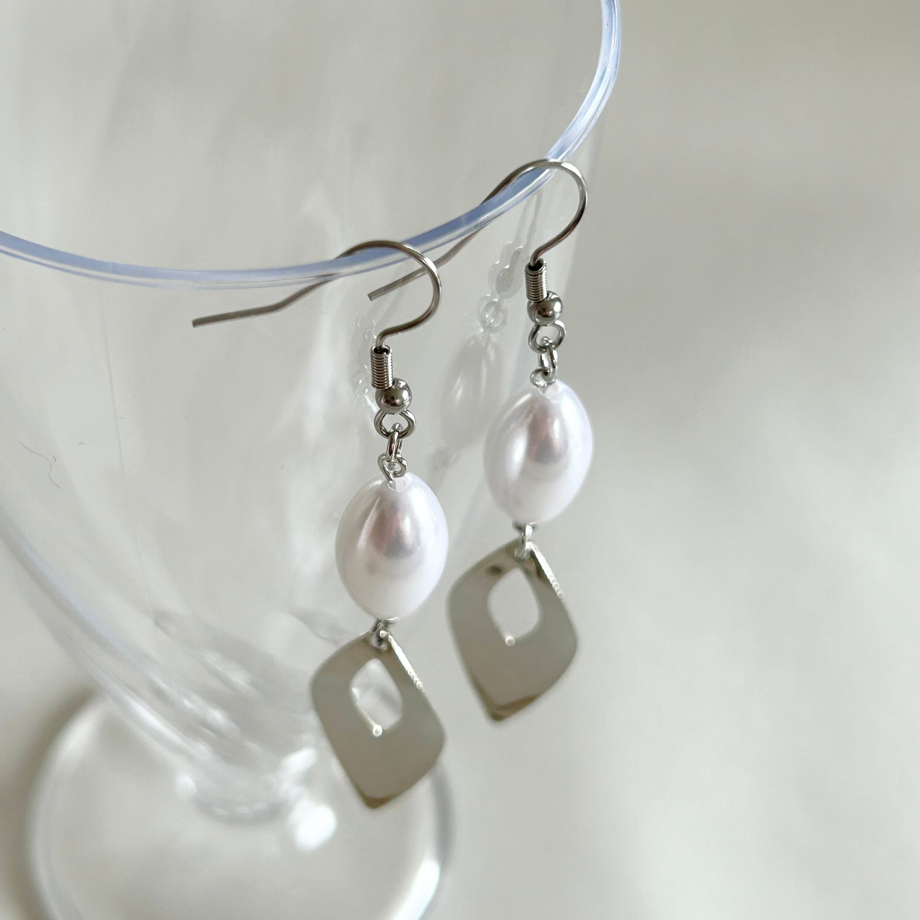 そんなイメージを込めてお作りした、上品なホワイトパール風×シルバーパーツの大人ピアスです。