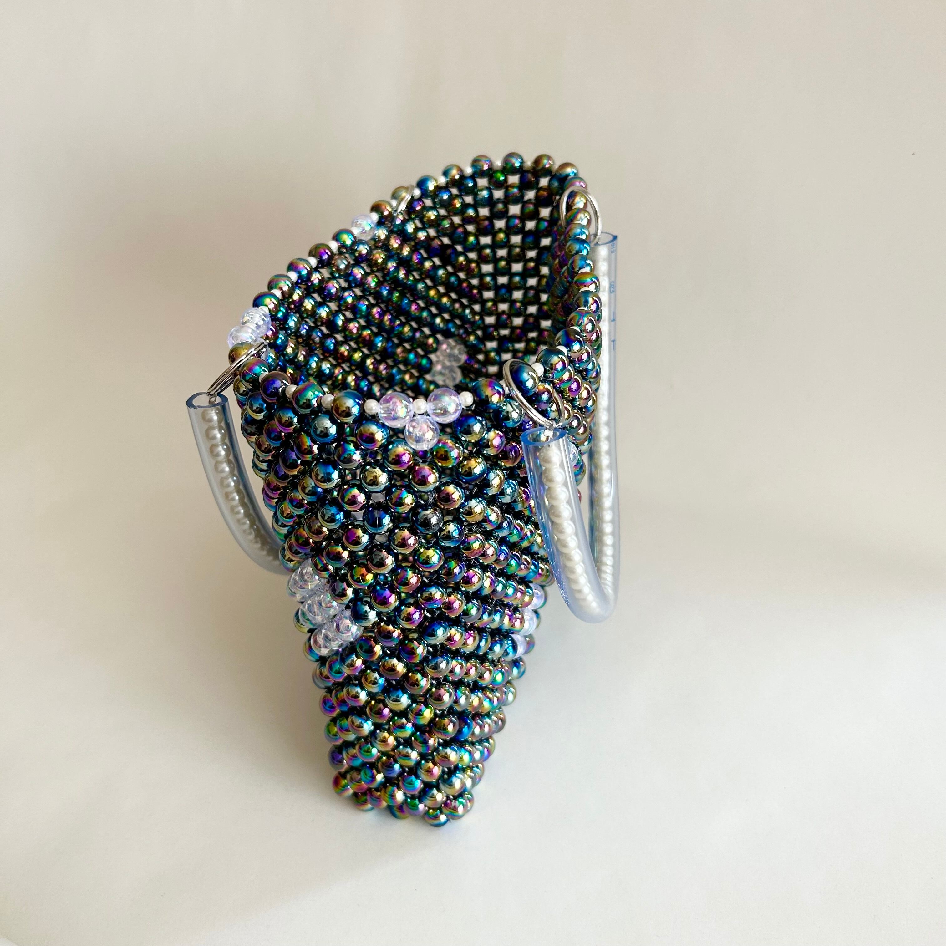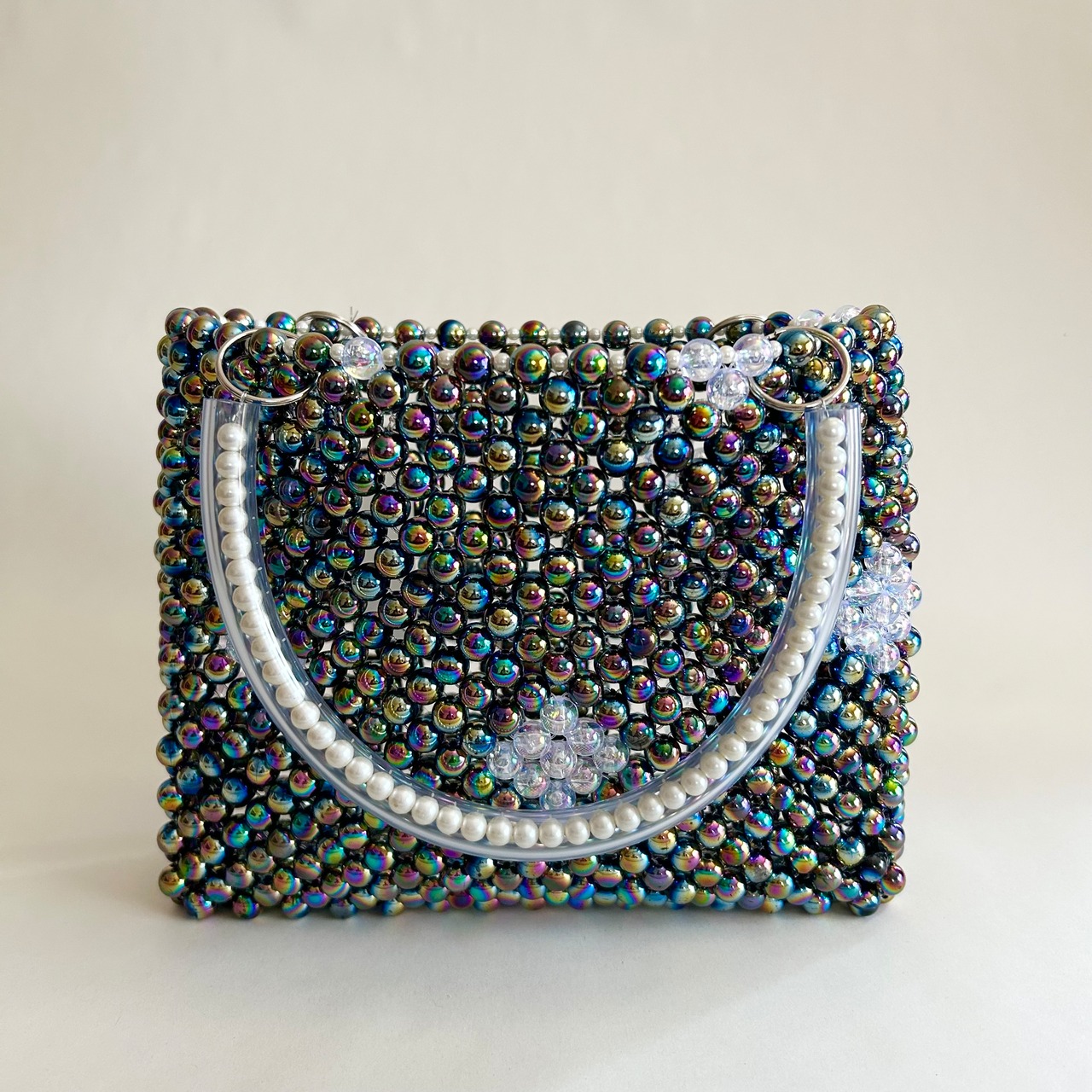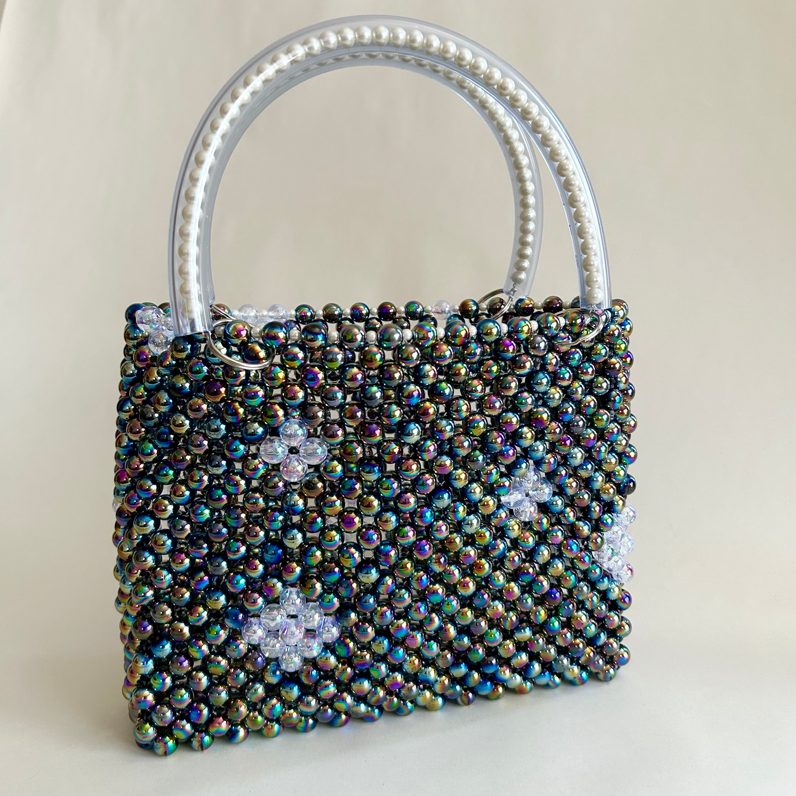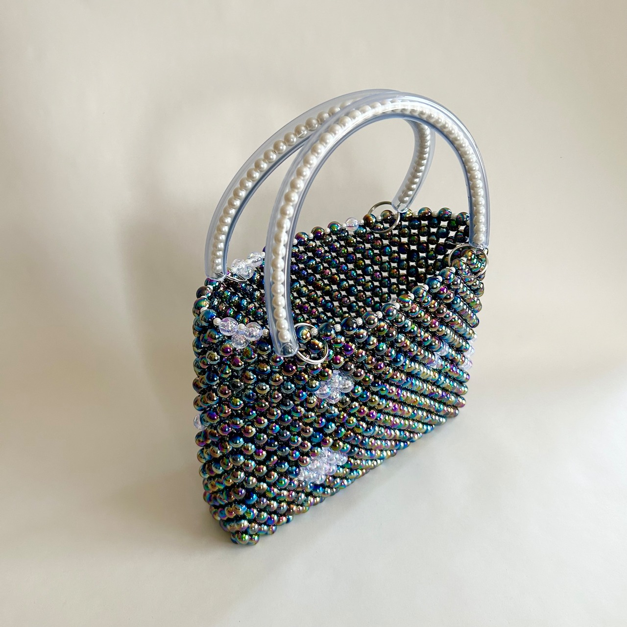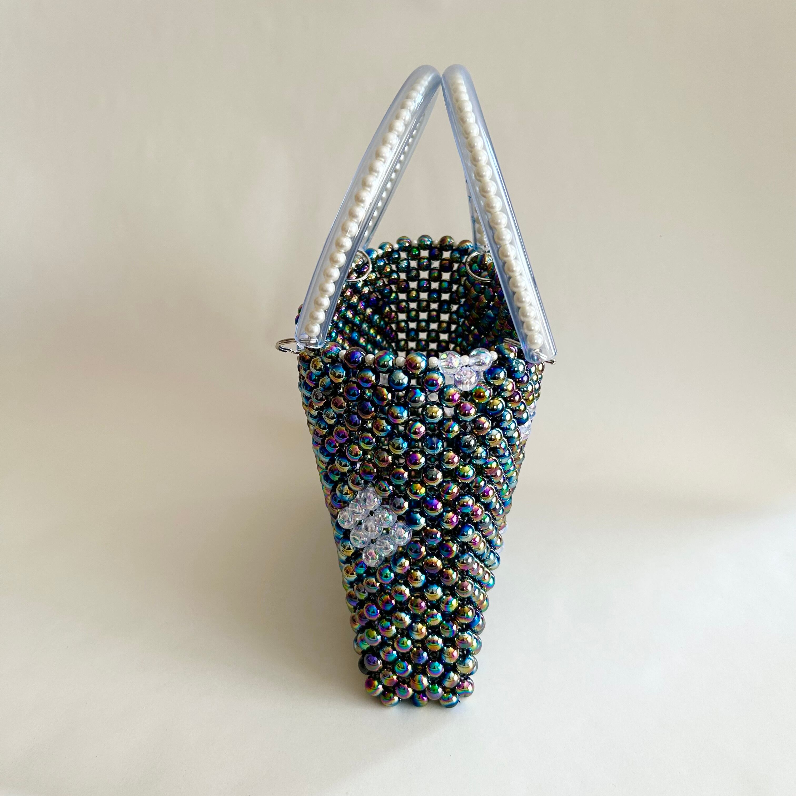 メインには、オーロラ加工が施された丸ビーズをぎゅっと編み上げ、バッグ全体に立体的な艶ときらめきをプラス。角度によって表情を変える色彩が、手に取るたび心をときめかせてくれます。